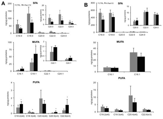 Fatty acid profiles of control and H-RasV12 expressing fibroslasts (A) and their released EVs (B). Lipids were extracted, and total fatty acids composition were analysed by GC-MS. Data, are expressed as ng fatty acids/µg proteins and are presented as mean ± S.D (n = 6). * p < 0.05 (control vs. H-RasV12). SFA: saturated fatty acids; MUFA: mono-unsaturated fatty acids; PUFA: poly-unsaturated fatty acids.