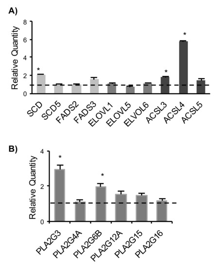 To gain insight into transcriptional changes underlying the different fatty acid profile of H-RasV12 vs. control fibroblasts, we analyzed the expression of several genes involved in fatty acid metabolism, i.e., desaturases (stearoyl-CoA desaturase, SCD and fatty acids desaturase, FADS), elongases (ELOVL) and acyl-coenzyme A synthetases (ACSL) by qRT-PCR. Among genes expressed in fibroblasts (Supplementary Table S1), we observed an up-regulation of SCD and notably, of 2 out of 3 ACSL genes, i.e., ACSL3 and ACSL4 (Figure 4A). The increased expression of SCD gene (stearoyl-CoA desaturase 1 or delta-9 desaturase) in H-RasV12 fibroblasts (Figure 4A) well correlated with the observation that our model of oncogene-induced senescence is characterized by higher content of C16:1 and C18:1 (Figure 3A). Furthermore, we investigated the expression of phospholipase A2 transcripts, which are involved in the release of fatty acid precursor of lipid mediators from membrane phospholipid and found that PL2G3 and PLA2G6B were significantly up-regulated (Figure 4B).