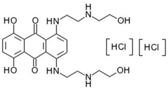 These factors promote zebrafish as a model for research on clinical drugs. Mitoxantrone (Novantrone) is an antineoplastic well known for inhibiting DNA replication and RNA synthesis in both dividing and non-dividing cells [7]. Clinically, mitoxantrone hydrochloride (Figure 1) injection was in wide use instead of mitoxantrone without hydrochloric acid molecules. Mitoxantrone hydrochloride has the same curative effect with mitoxantrone, but with much higher solubility. Human metabolites of mitoxantrone include most unchanged protype drug and some metabolites, including mono/dicarboxylic acids [8] and cycle naphthoquinoxaline [9]. The metabolites of mitoxantrone have same bioactivity with parent structure. The bile route is the main metabolism pathway and urine route also accounts [10,11]. Notwithstanding the widespread use and promising clinical value on the chemotherapy and the knowledge attained from clinical practice, pharmacokinetics, and toxicology, the mechanism of mitoxantrone remains unclear. For example, the effect of mitoxantrone on brain tumors is limited because of its poor ability to cross the blood–brain barrier [12]. The risk and pathway of mitoxantrone-induced cardiotoxicity and heart failure are vague [13]. Cytostatic agents and most of their intermediates and metabolites are usually bioactive after in vivo metabolism, making them bioactive even in the effluent. These agents thus are toxic to aquatic organisms at very low concentrations [14,15]. As a cytostatic agent, mitoxantrone exhibits bioactivity and likely poses adverse effects to aquatic organisms. The clinical values in the treatment of human diseases and the exploration of potential subtle effects of mitoxantrone have yet to be further investigated. Zebrafish offers a new approach in the research of mitoxantrone.