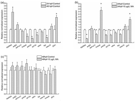 The expression levels of a set of target genes were normalized with gapdh. The target set included the remaining ten genes—18S rRNA, polr2d, tbp, hmbsb, rpl13α, actβ2, tubα1b, eef1a1l1, sdha, and β2m—used in this study. To analyze the inducement factors for expression levels changing of target changes, the comparisons between embryos at 24 hpf and 48 hpf, exposed and unexposed embryos at 24 hpf, exposed and unexposed embryos at 48 hpf were conducted respectively. Compared to the 24 hpf control (0 μg/L mitoxantrone) groups, the normalized expression levels of four genes, including hmbsb, polr2d, rpl13α and tbp significantly decreased (p < 0.05), while two genes 18S rRNA, β2m increased significantly (p < 0.05) at the 48 hpf control groups (Figure 2a); the normalized expression levels of five genes, including 18S rRNA, eef1a1l1, polr2d, rpl13α and tbp decreased significantly, while hmbsb and β2m increased significantly at 24 hpf embryos with 10 μg/L mitoxantrone treatment (Figure 2b). Notably, compared to the 48 hpf control groups, the normalized expression levels of 18S rRNA, polr2d, tbp, hmbsb, rpl13α, actβ2, tubα1b, eef1a1l1, sdha, and β2m showed no changes at 10 μg/L mitoxantrone exposed 48 hpf embryos (Figure 2c).