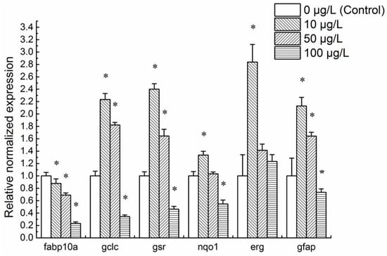 The expression levels of classical toxicity biomarker genes fabp10a, gclc, gsr, nqo1, gfap, and erg in 48 hpf embryonic zebrafish exposed to gradient mitoxantrone (0, 10, 50, and 100 μg/L) were analyzed with gapdh as internal control. The primers (Table 5) were designed and synthesized as described in Section 2.4. All reaction systems (25 μL) were as follows: 12.5 μL of SYBR Green Premix (Tiangen, Beijing, China), 2 μL of cDNA template, and 0.5 μM primer forward/reverse. Up to 25 μLof MilliQ water was added. The reaction procedure was as follows: 95 °C for 15 min; 95 °C for 10 s, and 60 °C for 30 s. 35 cycles. 65–95 °C with increments of 0.5 °C every 5 s for melt curve. Quantification cycle (Cq) cutoffs of 35 were applied. All reactions were carried out in triplicates.
