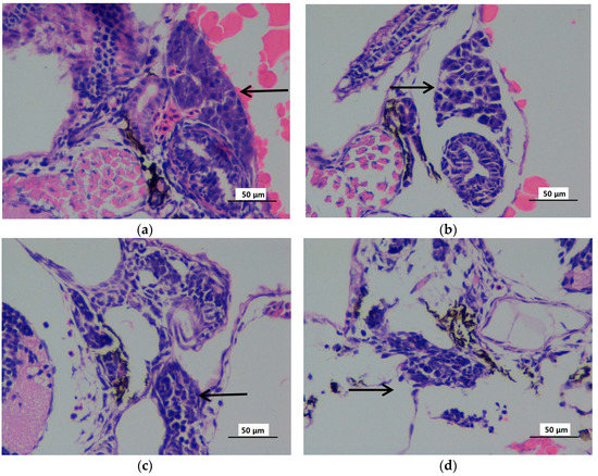 The hematoxylin-eosin staining microphotographs of zebrafish liver (72 hpf) exposed to gradient concentrations of mitoxantrone (×400). The zebrafish embryos exposed to 0 (a), 10 (b), 50 (c) and 100 (d) μg/L mitpxantrone were observed at 72 hpf with hematoxylin–eosin staining. The black arrow indicated the liver tissues. The scale bar indicated 50 μm.