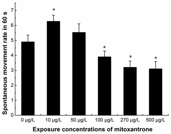 Neurotoxicity was also observed with decreased spontaneous movement. The spontaneous movement was recorded in 24 hpf zebrafish embryos every 60 s. The data showed that the spontaneous movement rates increased significantly in 10 μg/L mitoxantrone exposed embryos (p < 0.05), and the spontaneous movement rates decreased significantly when zebrafish embryos were exposed to mitoxantrone concentrations higher than 100 μg/L in a dose-dependent manner (p < 0.05) (Figure 5).