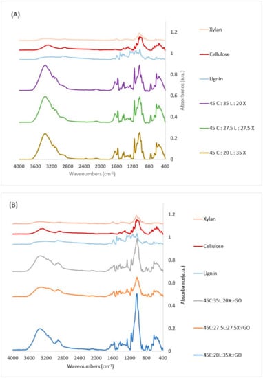 FTIR spectra of (A) material components of lignocellulosic films without rGO and (B) of material components of lignocellulosic films with rGO.