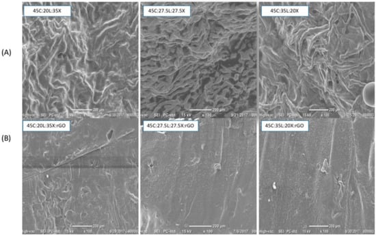 SEM images: (A) lignocellulosic blended films and (B) lignocellulosic blended films with rGO.