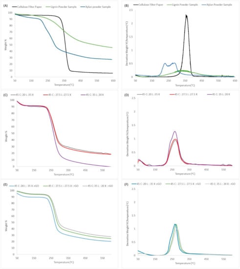 TGA percent weight decomposition analysis for (A) pure Samples, (C) lignocellulosic blended films and (E) lignocellulosic blended films with rGO. TGA derivative percent weight decomposition analysis for (B) pure samples, (D) lignocellulosic blended films and (F) lignocellulosic blended films with rGO.