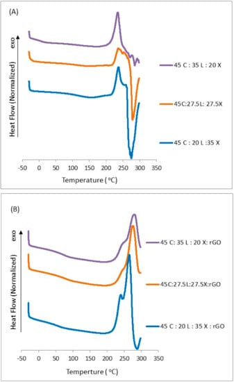DSC curves of blended lignocellulosic films (A) without rGO and (B) with rGO.
