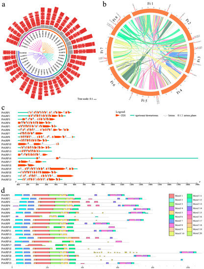 We also used MEME web servers to search for conservative motifs shared with the ARF proteins. Twenty different conserved motifs were found, and motifs 2, 3, 4, and 6 encode ARF domains. As shown in Figure 3, most ARF members in the same clade, especially the most closely related members, usually share common motifs (for example, FtARF8 and AtARF8), indicating potential functional similarities between the ARF proteins.
