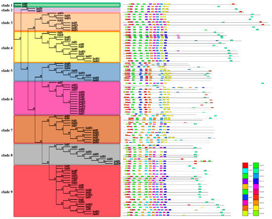 The number of FtARF genes identified was similar to those of Arabidopsis thaliana, rice, and maize species ARF gene family members [13,14,33], but the genome size of the four species was very different (tartary buckwheat, 516 Mb; Arabidopsis thaliana, 125 Mb; rice, 450 Mb; maize, 2300 Mb). This indicated that the ARF gene family remained stable in different species over the long evolutionary process. Based on the existing FtARF gene, we studied the duplication and diversification of ARF genes in the course of evolution in more detail. The phylogenetic tree of the ARF protein sequence of two monocotyledonous plants (rice and maize) and two dicotyledonous plants (Arabidopsis thaliana and tartary buckwheat) was constructed by using Geneious R11 [33,34]. The ARF proteins were divided into nine clades by the phylogenetic tree as shown in Figure 3. Each of the four species contributed at least one ARF gene to Clade 3, Clade 4, Clade 6, Clade 7, and Clade 9, and the two branches (including Clade 3, 4 and Clade 5, 6, 7, 8, 9) were divided into several subbranches. ARF members from related species were clustered in these two branches.
