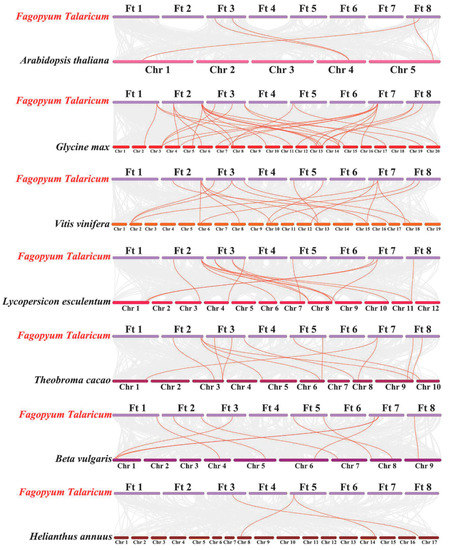 Synteny analysis of ARF genes between tartary buckwheat and seven representative plant species. Gray lines in the background indicate the collinear blocks within tartary buckwheat and other plant genomes, while the red lines highlight the syntenic ARF gene pairs.