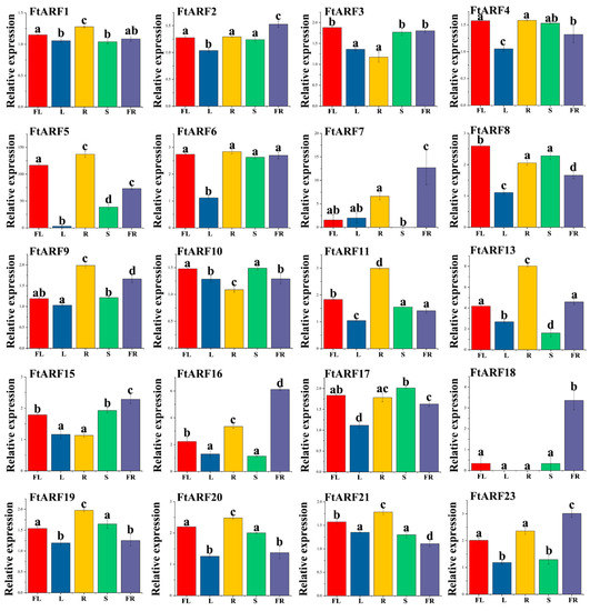 Expression profiles of 20 FtARF genes. The expression patterns of 20 FtARF genes in flower (FL), leaf (L), root (R), stem (S), and fruit (FR) tissues were examined by a qPCR assay. Error bars were obtained from three measurements. Small letter(s) above the bars indicate significant differences (α = 0.05, LSD) among the treatments.
