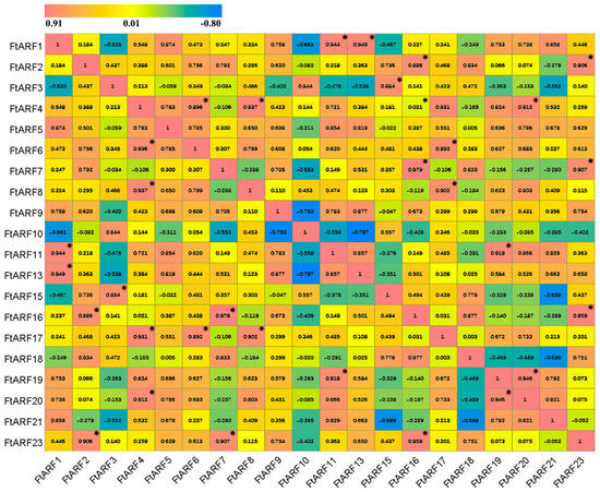 The correlations between the gene expression of the FtARFs in flower, leaf, root, stem, and fruit tissues. Red: positively correlated; blue: negatively correlated. * indicates significant correlation at 0.05 levels.