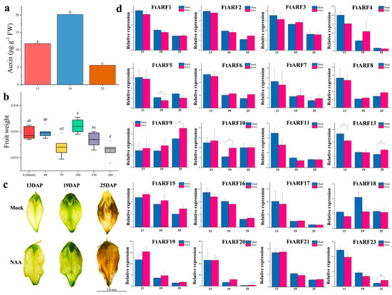 Fruit development of tartary buckwheat under exogenous auxin treatment. (a) IAA content during fruit development. (b) Final weight of the fruits treated with different concentrations of exogenous auxin. x-axis: weight of mature fruit, y-axis: concentration of naphthalene acetic acid treatment. (c) Pictures of the fruits treated with exogenous auxin during fruit development. (d) Differences in the expression of 20 FtARF genes under exogenous auxin treatment during fruit development. Mock: the same amount of water treatment, NAA: 100 mg·L−1 naphthalene acetic acid treatment. Error bars were obtained from three measurements. Small letter(s) above the bars indicate significant differences (α = 0.05, LSD) among the treatments. * and ** indicate significant correlation at 0.05 and 0.01 levels, respectively.