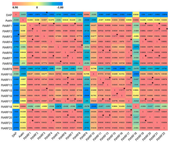 The correlation between the gene expression of FtARFs and auxin during fruit development. Red: positively correlated; Blue: negatively correlated. * indicates significant correlation at 0.05 levels.