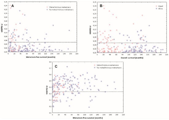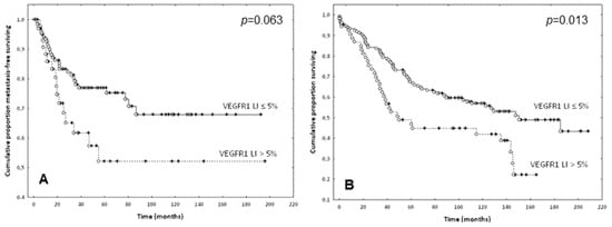 The non-parametric Mann-Whitney and Kruskal-Wallis tests were used to compare independent groups of numerical data. Survival data were analyzed using the univariate or multivariate Cox regression method. We analyzed the set of clinicopathological variables and then selected those that showed a significant contribution (characterized by a p-value < 0.05) in the multivariate Cox model. Then, we added the VEGFR-1 and/or VEGFR-2 LIs to the resulting clinical model to test their potential prognostic contribution to metastasis development and mortality as outcome parameters. Metastasis-free survival (MFS) was calculated as the time between surgical intervention and detection of metastasis on imaging; overall survival (OS) was calculated as the time between surgery and death, as officially registered. The prognostic impact was also illustrated by means of the standard Kaplan-Meier analysis and the Wilcoxon-Gehan test. All statistical analyses were carried out with Statistica software (StatSoft, Maisons-Alfort, France). A p-value < 0.05 was considered as statistically significant.