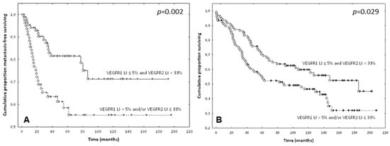 The Kaplan-Meier curves and the Wilcoxon-Gehan test showed that the patients of the first group (VEGFR-1 LI ≤ 5% and VEGFR-2 LI > 33%) had longer MFS (p = 0.002) and OS (p = 0.029) (Figure 5).