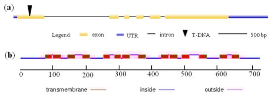 Sequence analysis of rice yellow stripe-like 13 (OsYSL13) in rice. (a) The gene structure of OsYSL13. The cDNA of OsYSL13 was cloned from the cDNA library of Oryza sativa cv. Nipponbare and its sequence were consistent with the sequence published in the GenBank/EMBL databases (accession number Os04g0524500). Exon, intron, and 5′ and 3′ untranslated region (UTR) were shown. The T-DNA was inserted into the first exon. (b) Predicted transmembrane domains of OsYSL13 by TMHMM2.0. There were 14 transmembrane domains in OsYSL13.