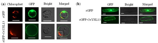 In order to investigate the potential function of OsYSL13, subcellular localization was determined by the transient expression of the sGFP-OsYSL13 fusion protein in the rice leaf protoplasts and onion (Allium cepa) epidermal cells. GFP fluorescence signal was mainly observed in the plasma membrane (Figure 2a,b), which was located outside of the chloroplast (Figure 2a). The results suggested that OsYSL13 was involved in intercellular transport but not intracellular transport of metal.