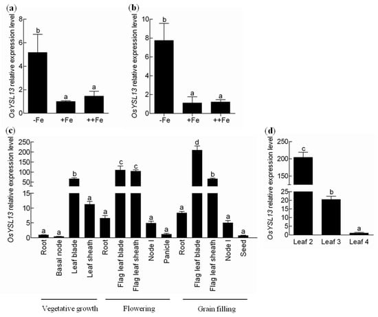 It has been reported that OsYSL13 was up-regulated by Fe deficiency in the roots []. In order to examine the expression pattern of OsYSL13 in response to different Fe levels, the quantitative real-time PCR was performed. As expected, OsYSL13 was induced by Fe deficiency both in the roots and shoots (Figure 3a,b). The expression level of OsYSL13 under Fe excess was similar to that under normal condition (Figure 3a,b). These results suggest that OsYSL13 is involved in Fe homeostasis. Different tissues at the vegetative growth, flowering, and grain filling stages were also sampled for the tissues-specific expression analysis of OsYSL13. Higher relative expression level of OsYSL13 was found in the leaf blades and sheaths at all the three stages mentioned above, as compared with the expression of OsYSL13 in the roots at vegetative growth (Figure 3c). Furthermore, OsYSL13 was expressed highly in the leaf blades in comparison with the leaf sheaths at the vegetative growth and grain filling stages (Figure 3c). Among different stages, the expression of OsYSL13 in the leaf blades was increased with the age of plants (Figure 3c). For more detailed analysis, the relative expression level of OsYSL13 in the different leaves (from leaf 2 to leaf 4) was tested. The results showed that OsYSL13 was more highly expressed in the older leaves than the younger leaves (Figure 3d).