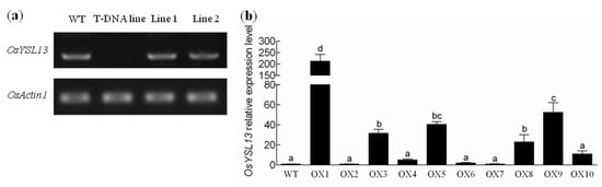 To evaluate whether OsYSL13 was involved in Fe homeostasis, a T-DNA insertion line (RMD_04Z11MA04) of OsYSL13 was obtained from the rice-mutant database []. The T-DNA was inserted into the first exon of OsYSL13 (Figure 1a). There was no transcript of OsYSL13 in this line, suggesting that it is a knocked-out mutant (Figure 4a). In addition, the OsYSL13-expressed complementation lines in the mutant background, and the OsYSL13 overexpression lines in the wild type background were also generated. The transcript of OsYSL13 was detected in the two independent complementation lines used in this study (Figure 4a). The expression of OsYSL13 increased significantly among these overexpression lines obtained, except for the overexpression (OX) lines 2, 6, and 7 (Figure 4b). Among them, line 1 increased the most and line 4 increased the least (Figure 4b). Line 3 and line 5 were chosen for further research.