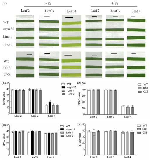 Phenotypic analysis of the osysl13 mutant, the complementation lines (Line 1 and 2), wild type and OsYSL13 overexpression lines (OX3 and OX5). (a) The fully expanded leaves of the plant materials during Fe deficiency (shown in the left) and sufficiency (shown in the right). Plants were grown in nutrient solution with or without Fe for 10 days. There were 5 leaves in each of these plant materials and the fifth leaf was not fully expanded. Scale bars = 0.5 cm. (b–e) The soil and plant analyzer development (SPAD) values of different leaves. (b,d) SPAD values of the different leaves in the osysl13 mutant, wild-type, and complementation lines during Fe deficiency (b) and sufficiency (d). (c,e) SPAD values of different leaves in the OsYSL13 overexpression lines and wild type during Fe deficiency (c) and sufficiency (e). The SPAD values were measured by the portable chlorophyll meter. It was difficult to measure the SPAD values of the unexpanded leaves. Significant differences compared with the wild type were determined by ANOVA (* p < 0.05). Data were shown as means ± SD (n = 3).