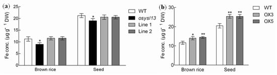 Many YSL members in rice and A. thaliana were reported to be involved in Fe distribution to the seeds [,,,,]. To check whether OsYSL13 plays a role in this process, Fe concentrations in the seeds and brown rice were measured. The results showed that Fe concentrations in the seeds and brown rice of osysl13 mutant were reduced, while these were increased in the OsYSL13 overexpression lines, compared with their corresponding wild type (Figure 7). This indicates that OsYSL13 is also involved in Fe distribution to the seeds.