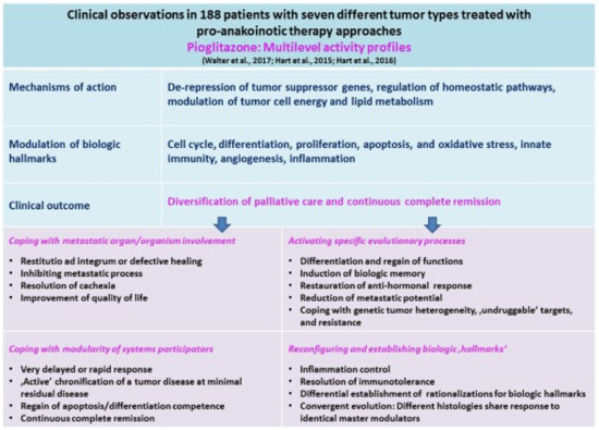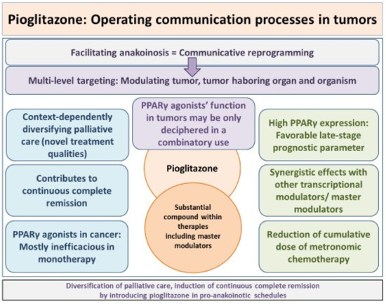 | Anakoinosis | Anakoinosis is a novel paradigm for cancer treatment based on a key role for communicative reprogramming of tumor systems. Building on a systems biology approach to cancer, anakoinosis utilizes a range of non-cancer and cancer drugs in combination to treat advanced tumor disease, such as pioglitazone. In contrast to standard therapies, anakoinosis protocols are characterized by low toxicity and a good safety profile, with encouraging responses in a number of clinical trials to date. The use of drug repurposing, that is the use of non-cancer drugs as cancer treatments, is especially a notable feature of this approach. |