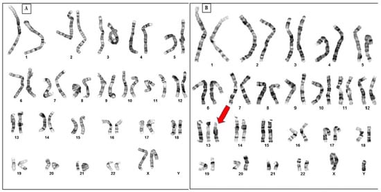 Karyotyping result; (A) Normal Karyotype of Healthy female and (B) Trisomy 13 in all cases (male = 20 and female = 17) of Patau Syndrome. Red arrow shows trisomy 13.