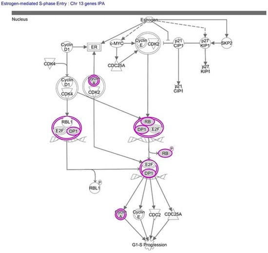 Estrogen-mediated S-phase Entry pathway derived from 308 protein coding genes of triosomy 13 (chromosome 13) using Ingenuity Pathway Analysis Tool.