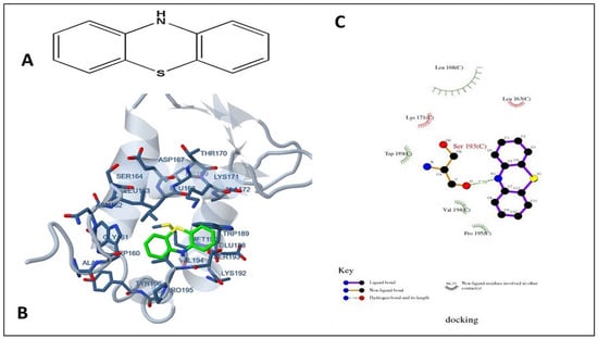 Molecular docking of phenothiazine with FOXO1 protein. (A) Depicting the molecular structure of phenothiazine; (B) Structure visualization of FOXO1 protein bound with ligand PTZ. The interacting residues are labeled in the binding site. (C) 2D plot of phenothiazine of FOXO1 showing ligand–protein interaction profiled by AutoDock software of Docking Server. Leu163, Leu168, Lys171, Trp189, Val194, Pro195, and Ser193 residues of FOXO1 showed crucial interactions with the phenothiazine.