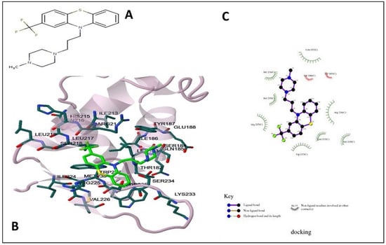 Molecular docking of trifluoperazine with FOXO1 protein. (A) Depicting the molecular structure of trifluoperazine; (B) Structure visualization of FOXO1 protein bound with ligand TFP. The binding site is shown and the interacting residues are labeled. (C) 2D plot of trifluoperazine of FOXO1 showing ligand–protein interaction profiled by AutoDock software of Docking Server. Leu183, Tyr187, Leu217, Arg225, Arg234, Ser184, Ser218, Ser234, Ser235 and Trp237 residues of FOXO1 showed crucial interactions with the trifluoperazine.