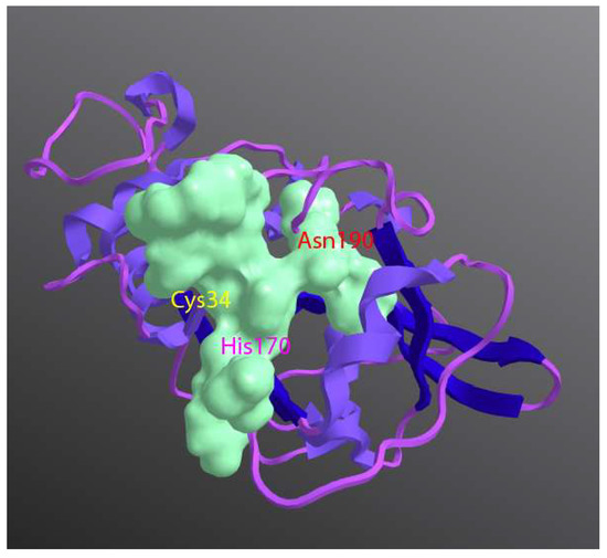 Structure of Der p 1 (Protein Data Bank (PDB): 2AS8; Der p 1.0105 isoform) with positions of catalytic residues shown. For clarity, a surface has been rendered over part of the substrate binding groove.