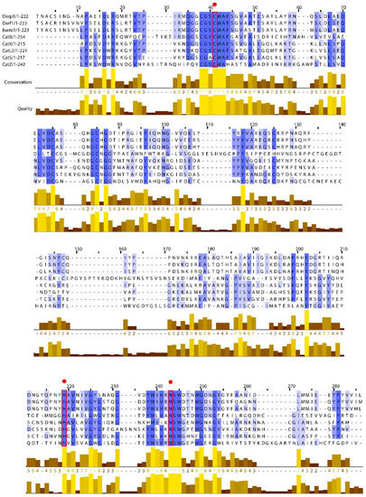 Multiple sequence alignments for the mature forms of HDM group 1 allergens from Dermatophagoides and Euroglyphus species with cathepsin family representatives (cat B, K, L2, S, and Z). Graphical representations of conservation and quality were created using Clustal Omega and Jalview. Threshold for conservation was set at 30%. Red rectangles and circles denote catalytic triad residues.