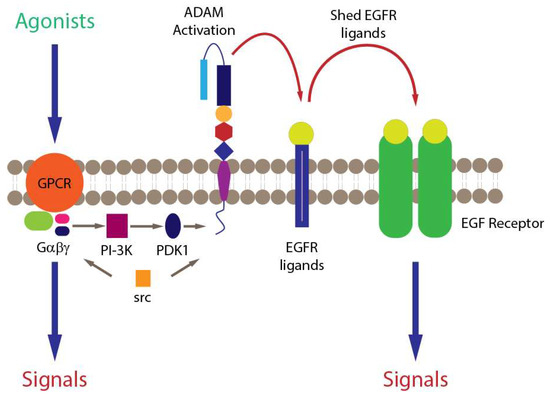 Mechanisms of signalling crosstalk between GPCRs and EGFR (Abbreviations: GPCR, G-protein coupled receptor; PI 3-kinase, phosphoinositide 3-kinase, PDK 1, phosphoinositide-dependent protein kinase 1; src, proto-oncogene tyrosine-protein kinase src; ADAM, a disintegrin and metalloprotease; EGF/EGFR, epidermal growth factor/receptor). Blue arrows denote initial agonist-receptor interaction and the signals derived directly or indirectly from it. Grey arrows denote intracellular signalling events involved in crosstalk. Red arrows denote extracellular signaling crosstalk.
