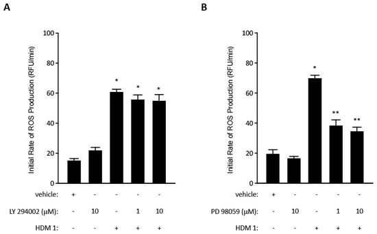 Effects of LY294002 (PI 3-kinase inhibitor) and PD98059 (mitogen activated protein kinase kinase inhibitor) on HDM-allergen stimulation of ROS generation in human airway epithelial cell line Calu-3. Data are shown as mean ± standard error values (n = 8). * p < 0.001 vs vehicle controls; ** p < 0.001 vs allergen-activated cells (1-way ANOVA with post-hoc testing by Student Newman Keuls procedure). The ROS production was quantified in cells loaded with dihydrorhodamine 123 as described in [78,103].