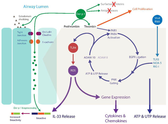 Schematic representation of a range of innate events triggered in airway epithelial cells by group 1 HDM allergens such as Der p 1. Proteolytic cleavage of tight junctions and adherens junctions facilitates transepithelial allergen delivery. Prothrombinase activity of the allergen leads to the canonical cleavage of PAR1 and PAR4, initiating a signalling cycle when enables the activation of TLR4 with the subsequent generation of ROS and the upregulation of inflammatory gene expression. Inactivation of airway defences (antiproteases and surfactant proteins) augment the effects outlined above. The release of the alarmin IL-33 from epithelial cells is facilitated by ROS and ATP and can be converted to a super-active form following cleavage by Der p 1.