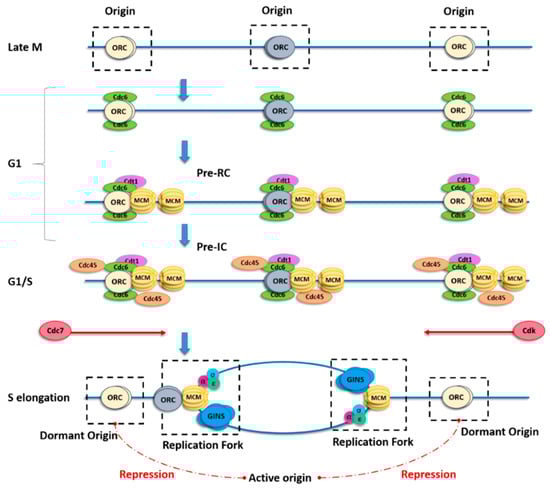 Complete and robust DNA duplication requires loading of minichromosome maintenance DNA helicase complex (MCM2–7) onto the replication origins. This step, called origin licensing, is restricted to the G1 phase of the cell cycle. A key initial step in origin licensing is the building of pre-recognition complex (Pre-RC) which starts with loading of the origin recognition complex (ORC) onto the chromatin. This ORC complex marks all potential origins providing spatial control of origin position. In higher eukaryotes, ORC binding sites were proven to be unrelated to DNA sequence, in contrast to other organisms such as yeast and bacteria [6,7]. It is currently assumed that multiple factors can characterize an origin, such as cytosine–phosphate–guanine (CpG) islands, G-quadruplexes, epigenetic marks, chromatin accessibility, sites of active transcription, or secondary DNA structures [8,9,10,11,12,13]. This is the reason why it is so difficult to identify metazoan replication origins. In the budding yeast Saccharomyces cerevisiae, a recent structural study [14] showed that two ORC molecules are required to ensure MCM2–7 complex loading onto the chromatin. During late mitosis and the G1 phase, ORCs bind cell division cycle 6 (Cdc6), which then interacts with chromatin licensing and DNA replication factor 1 (Cdt1) to allow loading of the six MCM subunits (MCM2–MCM7) and formation of the Pre-RC. The total amount of MCM complex does not change throughout the cell cycle, but the number of MCM complexes loaded onto DNA increases from telophase to the end of the G1–S phase transition. The final step of licensing requires the loading of Cdc45 and go-ichi-ni-san (GINS) onto the MCM complex to form the pre-initiation complex (Pre-IC). This complex requires the activities of the Dbf4-dependent kinase (DDK) and cyclin-dependent kinase (CDK) for its activation at the G1–S phase transition; then, the polymerases and other replication factors are recruited to allow origin firing (Figure 1).