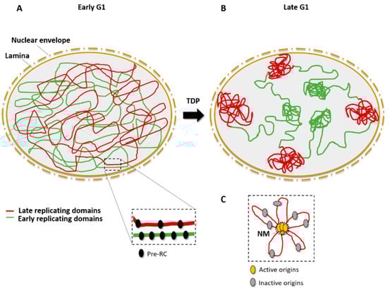 Replication clusters are organized in the three-dimensional (3D) nuclear space, where early-replicating domains locate mainly at the center of the nucleus while late-replicating domains are found predominantly at the nuclear periphery (Figure 2B). Chromatin conformation mapping methods such as Hi-C are very powerful for visualizing the spatial organization of early- and late-replicating domains [34,35]. Replication domains are created by topological reorganization of the chromatin in nuclear space. In metazoans, the association of particular replication domains with sub-nuclear compartments determines their replication timing. The set-up of this compartmentalization occurs at a specific time of the G1 phase and is called the timing decision point (TDP) [36,37] (Figure 2).