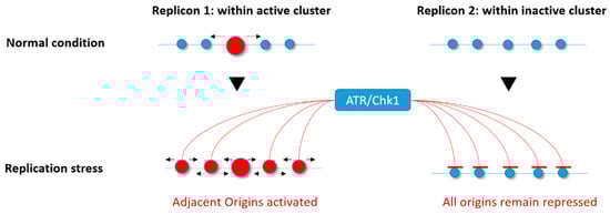 Ataxia telangiectasia Rad3-related (ATR)/checkpoint kinase 1 (Chk1) involvement in the differential regulation of origin firing under replicative stress. In response to replication stress, the ATR/Chk1 kinases allow the activation of dormant origins within active replicon clusters (active origin(s) in red) while repressing any firing within those that are not yet activated (inactive origins in blue).
