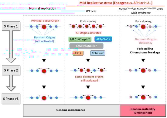 Hence, these two mouse models are close phenotypically, showing dormant origin deficiency due to reduced levels of loaded MCM onto the chromatin. Even in an unchallenged S phase, the inability to activate dormant origins leads to accumulation of stalled replication forks that reach mitosis and interfere with chromosome segregation. Both phenotypes lead to improper chromosome stability and premature tumorigenesis, with several differences in the latency of disease development [165,166,168,169].