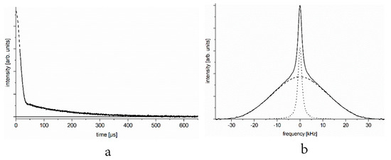 In Figure 1a, we show the typical 1H NMR free-induction decay (FID) signal of a set of spins containing proton–proton pairs of different mobilities. In Figure 1b, we present the deduced NMR spectrum. Similar FID signals and NMR spectra are observed at certain temperatures when studying the aqueous solution of a protein that contains hydrogen pairs.