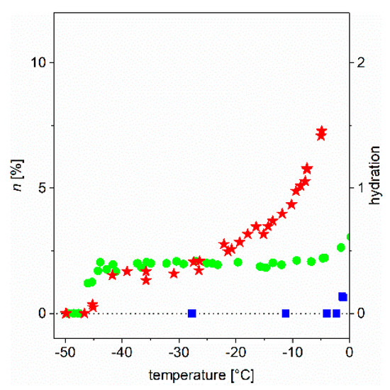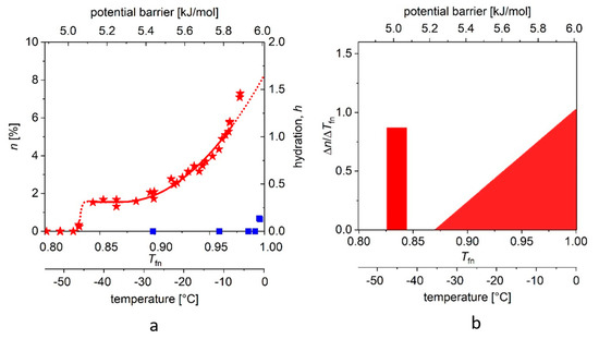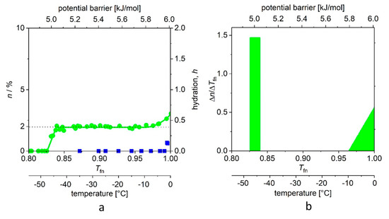 Figure 3b and Figure 4b depict the changes (differential quotient) of the mobile water fractions by normalized functional temperature, i.e., they are the graphical representations of Equation (4). As outlined, the bars at low temperature (around −45 °C) correspond to the relatively high differential quotient values describing the first few data points greater than zero. The fraction of mobile hydration water increases here within a few degrees to the level of n(Ea,o) or A while the first mobile hydration layer forms, which gives the high differential quotient values.
