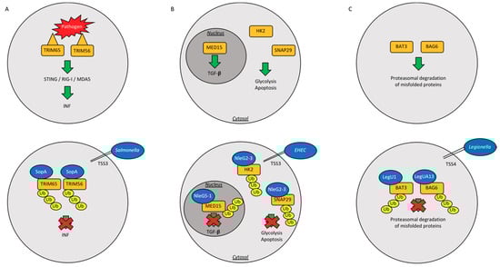 As mentioned before, HECHT ubiquitin ligases bind covalently ubiquitin. Diverse pathogen effectors are able to mimic eukaryotic HECHT ubiquitin ligases. SopA is one of the firstly-identified HECH TSS3 effector in Salmonella typhimurium [52]. Salmonella invades host macrophages and epithelial cells, where it can survive and replicate in a peculiar structure, defined as Salmonella containing vacuole (SCV), eliciting a pro-inflammatory response [53]. At the molecular level, SopA exerts its function by ubiquitylating two host ubiquitin ligases, TRIM65 and TRIM56 (Figure 3A) [54], and thus blocking the anti-microbial response mediated by Interferon-α (IFN-α) [55] (Table 1). TSS3 effector NleL is another HECHT ubiquitin ligase from enterohemorrhagic Escherichia coli [56,57,58]. NleL is able to ubiquitylate and downregulate the Translocated intimin receptor (Tir), an effector secreted into host intestinal cells. In this scenario, NleL downregulates the formation of pedestals, which are host actin-built structures that this species of pathogen utilizes for embodying the intestinal epithelium [56,57]. Conversely, NleL is able to mono-ubiquitylate host c-Jun NH2-terminal kinases (JNK) at lysine 68, disrupting its interaction with the upstream kinase MKK7 and suppressing the activity of the transcription factor activator protein-1 (AP-1), which results in the formation of actin pedestals [58] (Table 1).