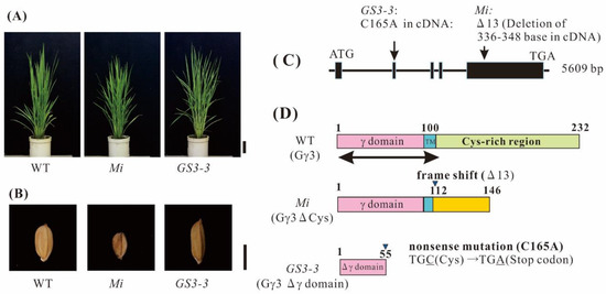 To confirm the functions of rice heterotrimeric G protein γ3 subunit in determining the plant morphology, we prepared plants possessing GS3-3 [30] and Mi [58] mutation with Taichung 65 as a background. The mutant, Mi was slightly dwarfed (Figure 1A) and set small seeds (Figure 1B), compared to those of the WT. GS3-3 had a height similar to that of the WT (Figure 1A) and set large seeds (Figure 1B). These results indicate that the mutations in Mi and GS3-3 clearly affected the seed size.