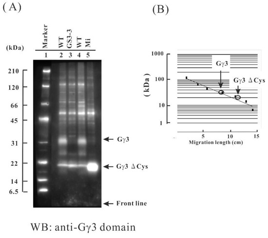 First, we detected the Gγ3 candidate from the WT and the truncated Gγ3 candidate (Gγ3∆Cys) from Mi by Western blotting using anti-Gγ3 domain antibodies (Figure 2A). In SDS-PAGE, the molecular weights of the Gγ3 and Gγ3∆Cys candidates were estimated as 32 and 20 kDa, respectively, which were larger than the molecular mass calculated using cDNAs, i.e., 24 and 16 kDa, respectively. These results indicate that modifications, such as glycosylation, ubiquitination, phosphorylation, and lipid modification (palmitoylation etc.), may have occurred after translation in the Gγ3 and Gγ3∆Cys candidates. The identification of the modification is a subject requiring further study. In order to obtain concrete evidence on whether the Gγ3 and Gγ3∆Cys candidates detected by western blotting were actually Gγ3 and Gγ3∆Cys proteins, the immunoprecipitation products of the Gγ3 and Gγ3∆Cys candidates were analyzed by LC-MS/MS (Figure 3 and Figure 4). As a result, four fragments, with p < 0.05 by the Mascot search engine, were obtained from the Gγ3 and Gγ3∆Cys candidates. These results indicated that the Gγ3 and Gγ3∆Cys candidates were actually Gγ3 and Gγ3∆Cys, respectively.