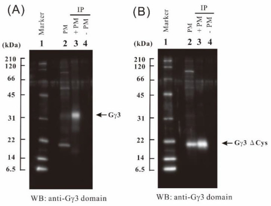 To concentrate Gγ3 and Gγ3∆Cys candidates, immunoprecipitation was carried out using anti-Gγ3 domain antibody. First, 50 μg of the anti-Gγ3 domain antibody was added to 1 mg each of solubilized plasma membrane protein of the WT (Figure 3A) and Mi (Figure 3B) flowers. Gγ3 and Gγ3∆Cys candidates were collected with the antibody cross-linked Protein A bound beads. The 32 kDa protein, a Gγ3 candidate in the WT (Figure 3A, lane 3) and 20-kDa protein, a Gγ3∆Cys candidate in Mi (Figure 3B, lane 3), were immunoprecipitated.