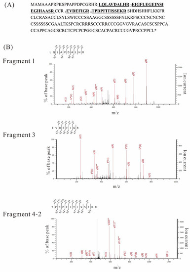Gel pieces were resuspended in 50 mM NH4HCO3, reduced with 50 mM dithiothreitol for 30 min at 56 °C, and alkylated with 50 mM iodoacetamide for 30 min at 37 °C in the dark. Alkylated proteins in the gels were digested with 10 μg/mL of trypsin solution (Promega, Madison, WI, USA) for 16 h at 37 °C. The resultant peptides were concentrated and suspended in 0.1% formic acid and analyzed by LC-MS/MS.