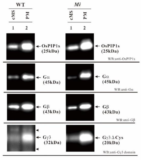 OsPIP1s is an aquaporin, which is a plasma membrane marker. Gα and Gβ are the subunits of the heterotrimeric G protein complex in rice. The OsPIP1s, Gα subunit, and Gβ subunit were enriched in the plasma membrane fraction. Furthermore, Gγ3 (32 kDa in WT) and Gγ3∆Cys (20 kDa in Mi) were also enriched in the plasma membrane fraction. These results showed that Gγ3 (32 kDa in WT) and Gγ3∆Cys (20 kDa in Mi) were localized in the plasma membrane fraction.