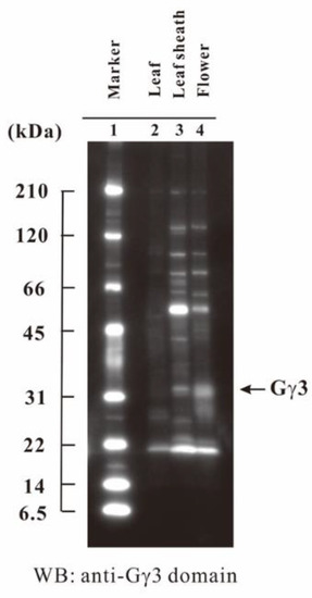 In order to know the tissues in which Gγ3 accumulates, the accumulation profile of Gγ3 was studied using the plasma membrane fractions of one-week-old etiolated seedlings of WT, developing leaf sheaths, and flowers. The results showed that the Gγ3 protein largely accumulated in the developing flower (Figure 6).