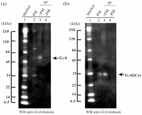To concentrate Gγ4 and Gγ4∆Cys candidates, immunoprecipitation was carried out using anti-Gγ4 domain antibody. Fifty micrograms of anti-Gγ4 domain antibody was added to 2 mg and 1 mg of solubilized plasma membrane protein of leaf sheath of WT (Figure 3a) and Dn1-1 (Figure 3b), respectively. Gγ4 and Gγ4∆Cys candidates were collected with the antibody cross-linked Protein A-bound beads. The Gγ4 candidate in WT (55 kDa; Figure 3a, lane 3) and Gγ4∆Cys candidate in Dn1-1 (27 kDa; Figure 3b, lane 3), were immunoprecipitated. Most other proteins detected by WB of plasma membrane fraction were not observed in the immunoprecipitated products.